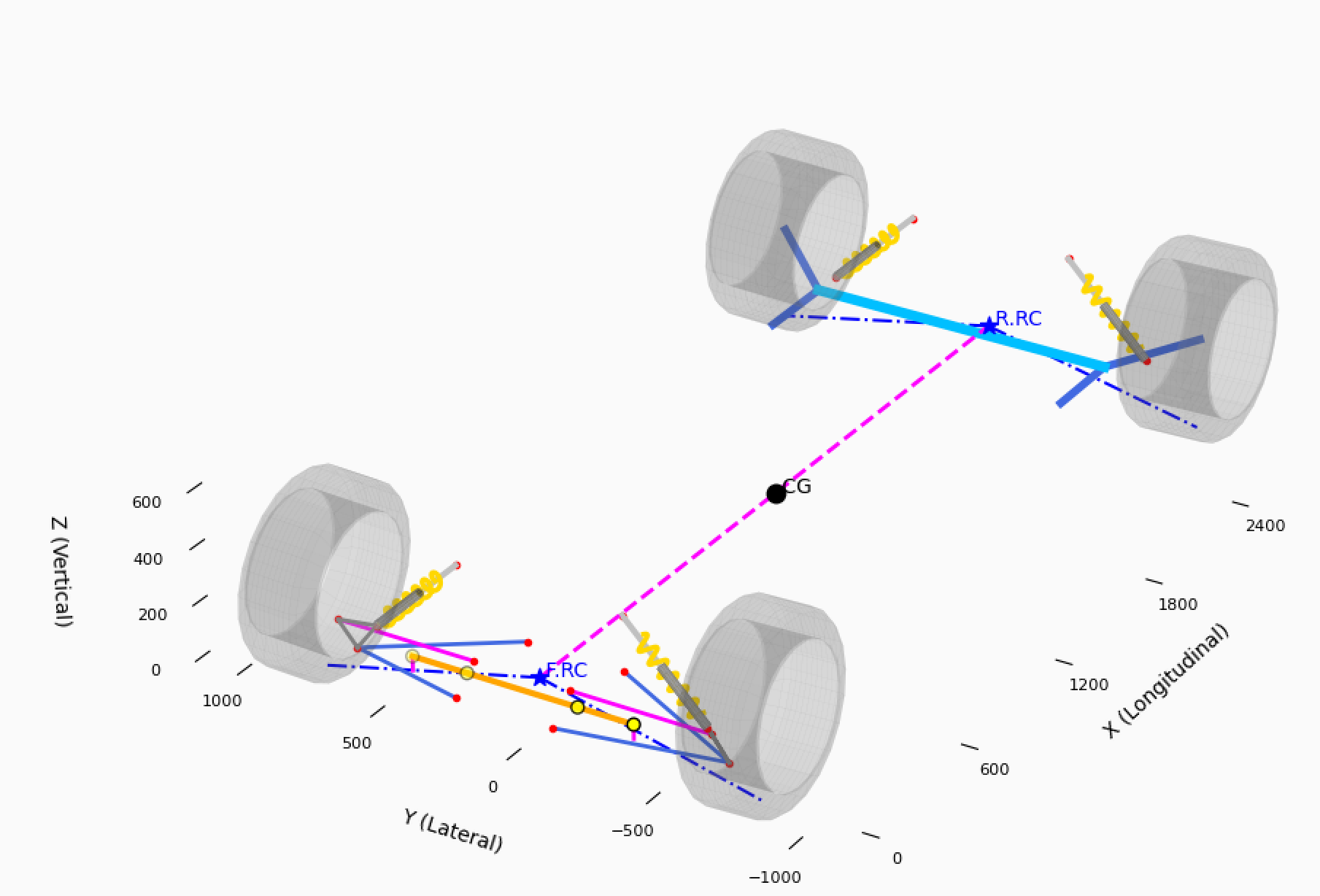• パラメータを変更した瞬間に、ロールセンターやキャンバー変化、アンチダイブ率などをリアルタイムで計算・可視化。複雑なサスペンションの動きを視覚的に把握できます。